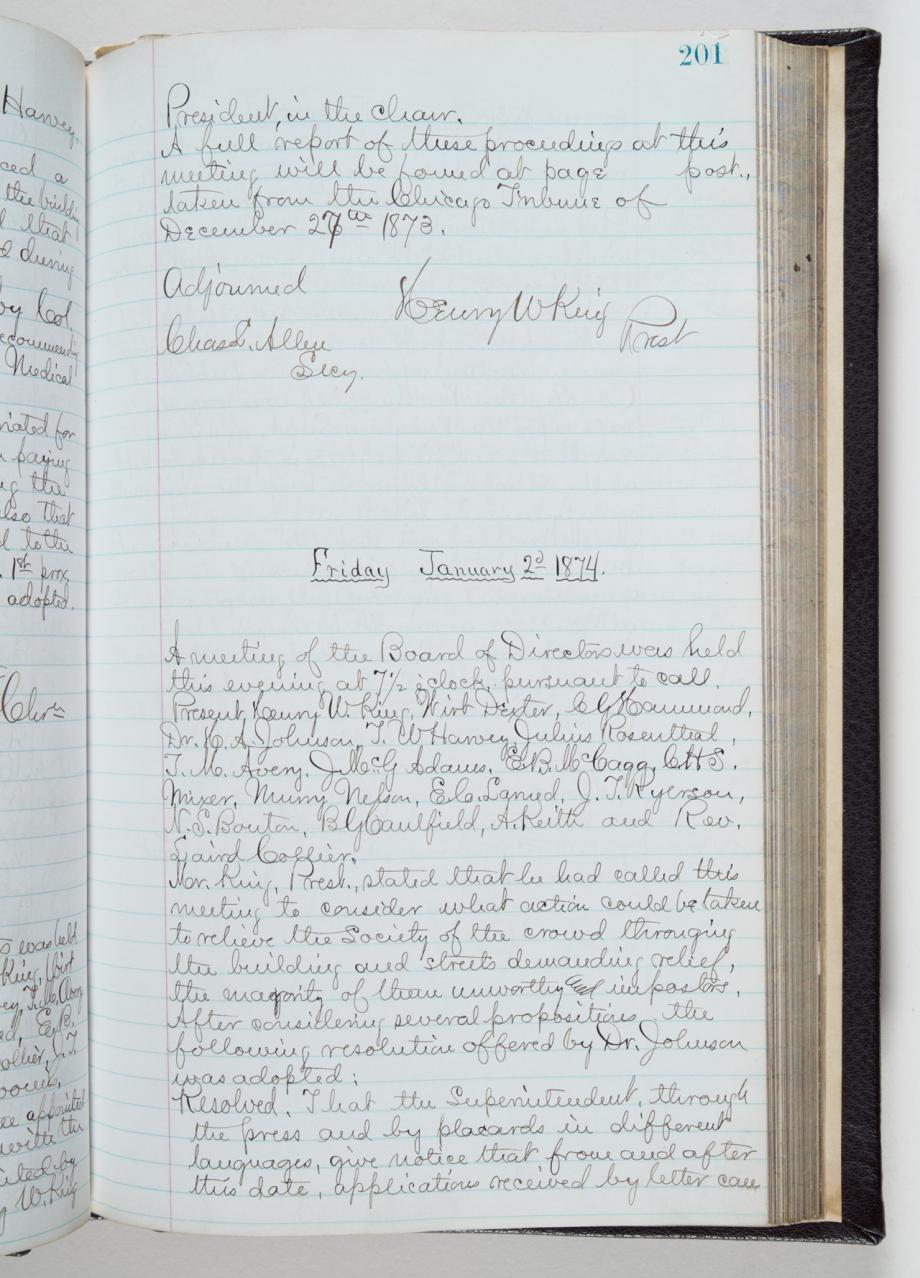 Trouble at Relief and Aid Society Headquarters; Minutes of the Meeting of the Board of Directors of the Chicago Relief and Aid Society, January 2, 1874 (ichi-62300)