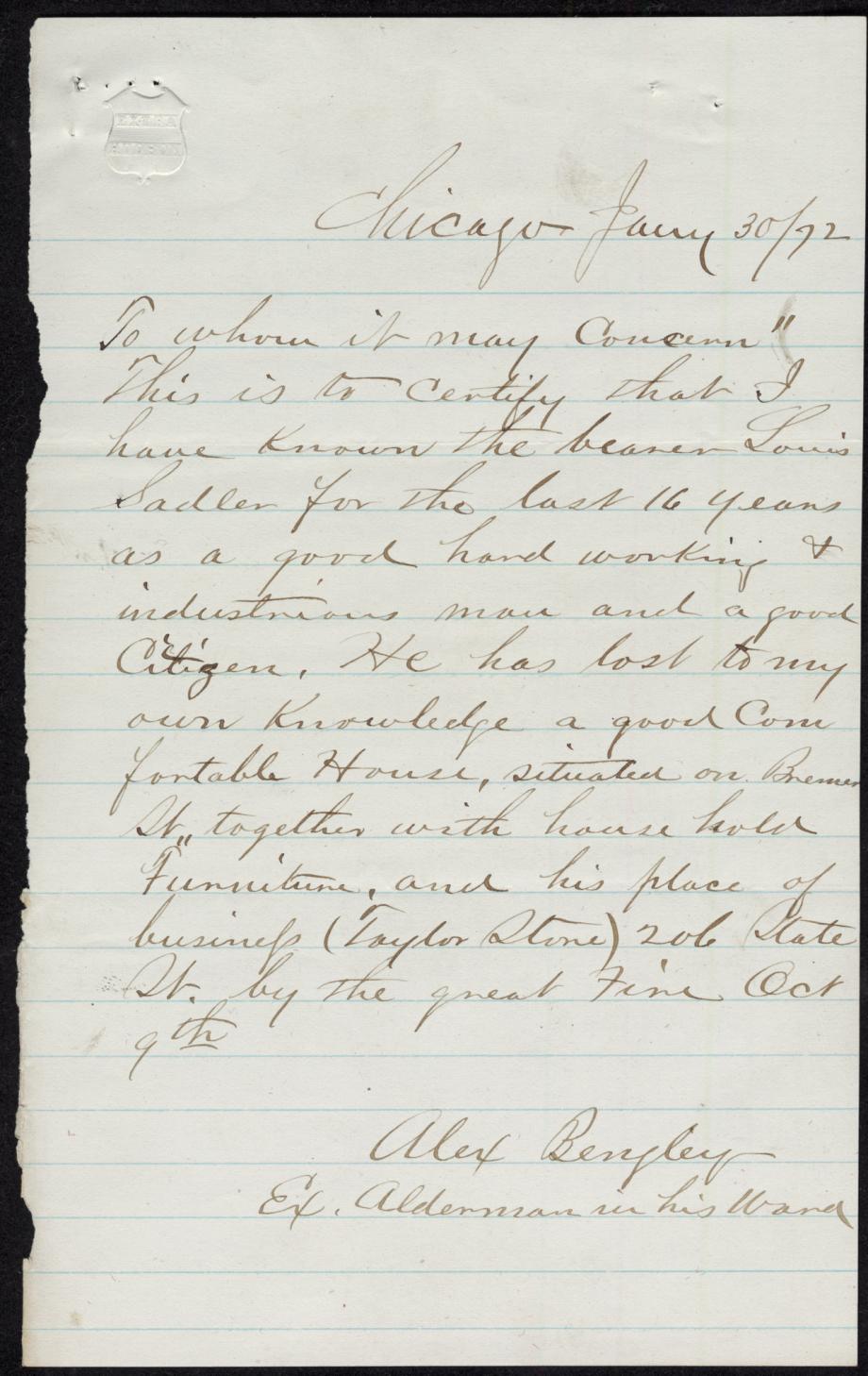 The Case of Lawrence Saddler, 4; Letter from Alex Bengley, January 30, 1872 (ichi-63783)