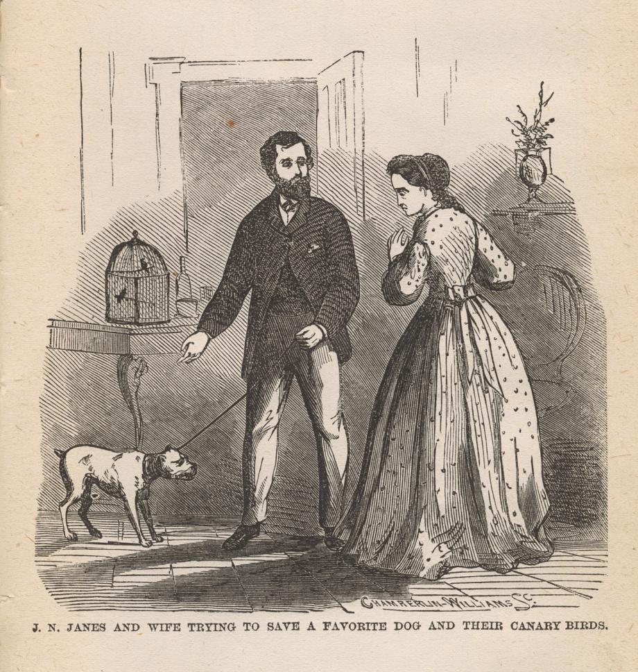 J.N. Janes and Wife Trying to Save a Favorite Dog and their Canary Birds; from Frank Luzerne, The Lost City!, 1872 (ichi-63831)