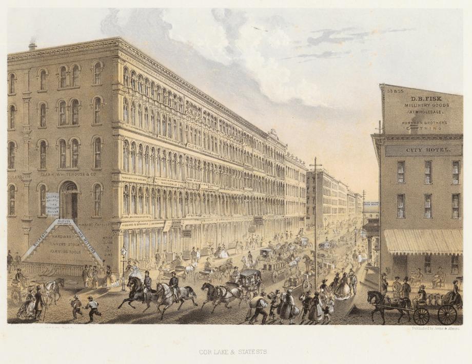Cor. Lake & State Streets; Louis Kurz for Jevne & Almini, Lithograph, 1866-67 (ichi-64272)