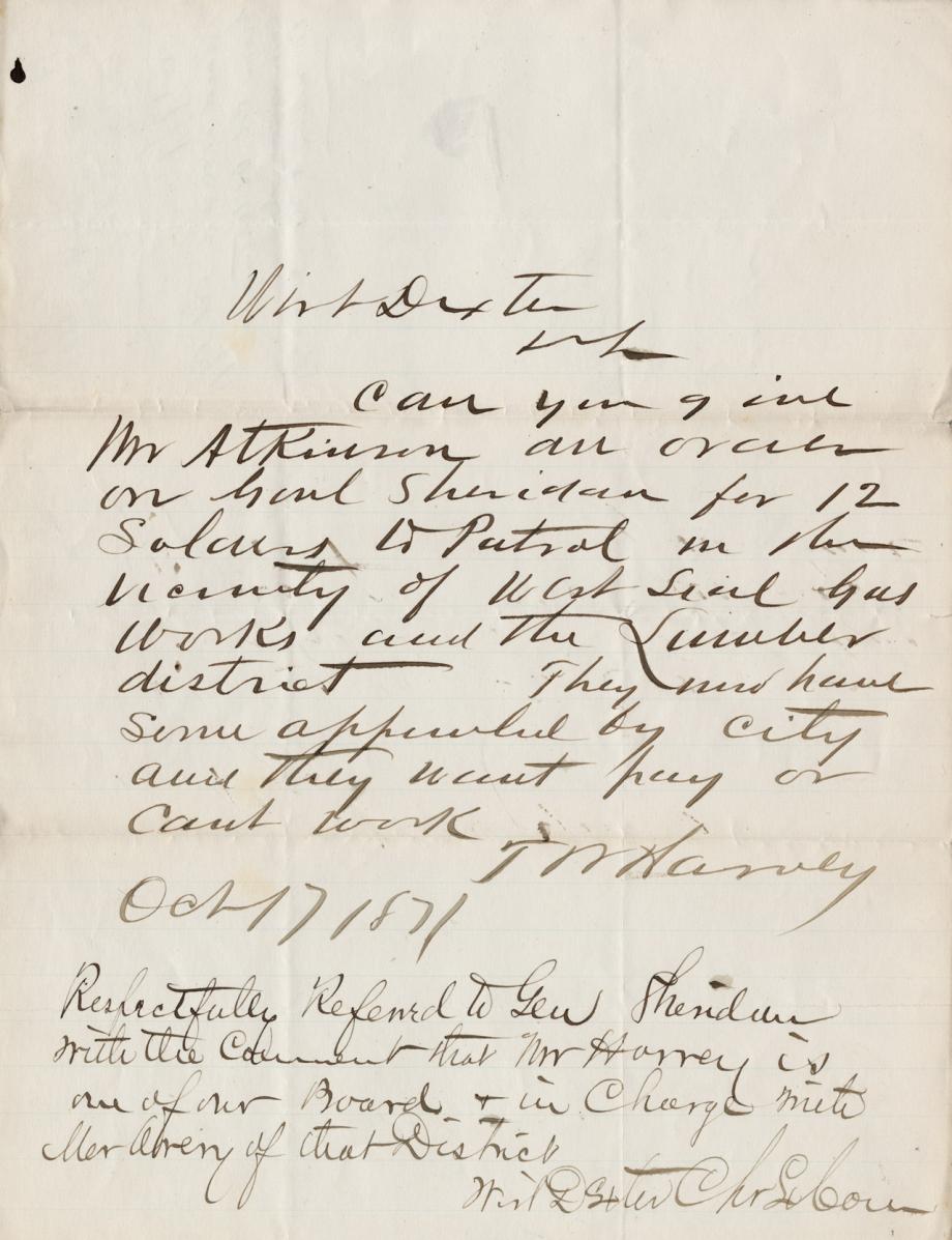 Special Request, 1; Letter from T. W. Harvey, Endorsed by Wirt Dexter, October 17, 1871 (ichi-64371)