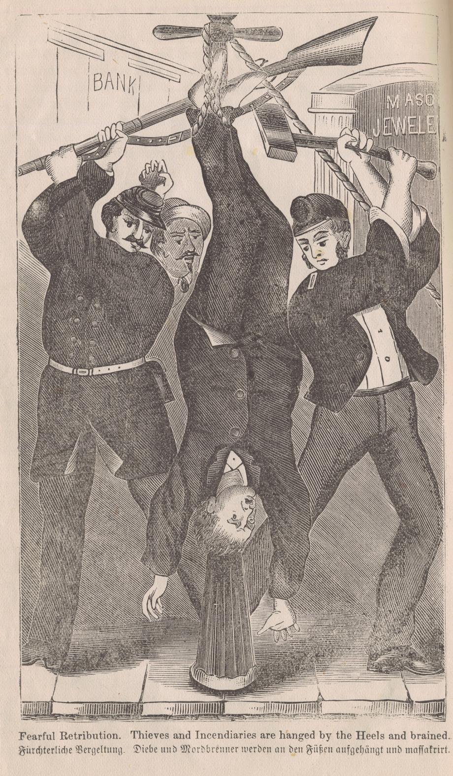 Home > Fearful Retribution. Thieves and Incendiaries are Hanged by the Heels and Brained; from George L. Barclay, The Great Fires of Chicago, 1871 (ichi-64421)